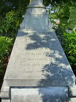 Caroline Laurence Marguerite Brouzet was born into a wealthy bourgeois family. In 1874, she married Vicomte Charles-Marie Pierre de Bonnemains (1851-1916),[3] the son of General Charles-Frédéric de Bonnemains. Therefore, she is also referred to as Madame de Bonnemains. The marriage failed and the couple was divorced in 1888. Brouzet became the lover of the French general and minister Boulanger and died of tuberculosis in his arms in July 1891. At his request, ″A bientôt″ (″See you soon″) was engraved on her tomb. Two months later he shot himself in front of her grave. His first name and ″Ai-je bien pu vivre 2 mois et 1/2 sans toi!″ (″Was I really able to live two and a half months without you!″) were added to the epitaph.