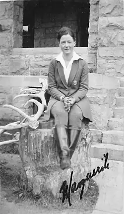 In 1921, during her college years, Lindsley was first employed as a temporary ranger-naturalist in Yellowstone.[9] In 1925, after receiving her graduate degree and returning to Yellowstone, she became the first permanent female park ranger in the country.[10] Some individuals, including Chief Inspector J.F. Gartland of the Department of the Interior, voiced strong opposition to the appointment of women rangers, and Lindsley noted that she felt pressure to perform well despite criticisms of her suitability for the position of a ranger: "many still think that women's work should be inside and it is a problem sometimes to satisfy everyone even tho [sic] I may be qualified for the work in the field."[11]