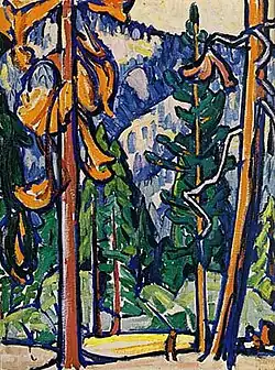 One of Marguerite and William's most influential summers was in 1920 when they spent the summer in Yosemite Valley, painting the landscape.[11] The couple, with their family, hiked, sketched, and painted the beautiful national park in the Fauvist style. The trip greatly moved the two, and themes from the trip would appear in many of their later works, including Marguerite's works Memories of my California Childhood (1921) and Nevada Falls, Yosemite Valley, California (1920).