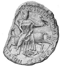 In about 1229-1230[4][5] or 1238,[6] she founded the charterhouse of Poleteins in Bresse;[2] her daughter Jeanne (d. 1260) became the prioress.[1] In the absence of her husband, Marguerite de Baugé managed the barony of Beaujeu, and used a seal on which she was depicted riding a horse and holding a hawk; the counter-seal showed the arms of Beaujeu.[7] In 1229, she confirmed a treaty made between her husband and Guy, Abbot of the monastery of Île Barbe.[2]