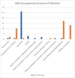 The largest sector in employment in 1881 for males was agriculture with 26. This was most expected as the parish covers some 1,400 acres and has always retained an agricultural community. Although over the last 50 years the domination of agriculture has diminished Marholm still retains its rural feel. In contrast with the most recent 2011 occupational census data (although fields are very different from the ones used in 1881) we see a large proportion has moved away from agriculture and into tertiary sector jobs, 44% of the Marholm population work in office related jobs. A large proportion of the female population in 1881 were recorded with either unknown of unspecified occupations with 13 and 17 respectively.[16][17]
