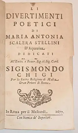 In 1677, in Rome, she published a collection of poems in two volumes entitled Li divertimenti poetici ("The poetic entertainments"),[3][4] which was reprinted in 1706. She also published the plays and musical dramas La Tirannide abbattuta dal trionfo della fede, Serenata spirituale, La ninfa del Tebro, Il trionfo di sant'Agata and Il Coraspe redivivo. The latter was staged in Ariccia in 1683.[5]