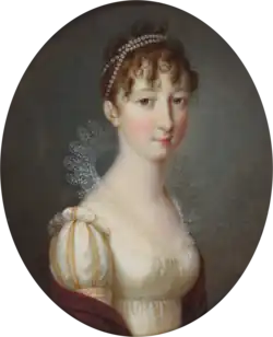 She, as leader of the war party in Austria,[1] was a great enemy of the French Emperor Napoleon I and therefore also in opposition to the Austrian foreign minister Prince Klemens von Metternich. The French had protested against the marriage because of her political views. She had considerable influence on her husband, and her talent at ruling marvelled many officials, including the Prussian minister who considered her the ruling genius at court. Maria Ludovika was also immensely popular with her subjects who hailed her a second Maria Theresa. Together with her brother-in-law Archduke John, she made the war effort popular.[2][3] During her coronation in Pressburg, she impressed the Hungarians so much that they declared large financial and military support for the monarchy if needed.[4] But the emperor hesitated and Archduke Charles, who had extensive control over military matters, advised caution. Only the effects of the Spanish revolt in 1808 allowed the war party to prevail.[5]