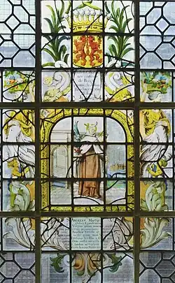 Maria Elisabeth's window is dedicated to Saint Serapion of Thmuis, a fourth-century Egyptian hermit. He is depicted in a Carmelite habit. The mitre next to him refers to his appointment as bishop of Antioch.