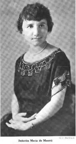 María was the fourth of five children born in Vitoria the capital of the Basque province of Álava. Her father, Manuel de Maeztu Rodríguez was a Cuban engineer and landowner from Navarre who had met her mother, Joan Whitney, the daughter of a British diplomat in Paris, when she was sixteen. María's parents never married.[1] In 1889 the unexpected death of her father in Cuba led to confusing administrative problems and the family was left in ruins. Her mother, a fragile but enterprising woman with a strong personality, took her three sons and two daughters to Bilbao and, in 1891, set up a residential school for girls to study French and English and improve their cultural skills. María started teaching at her mother's Anglo-French academy and then began to teach in the public schools of Bilbao. In 1903 she accepted the Ayuntamiento of Bilbao's post as director of the newly established night school for adults and also served as director of kindergarten (1902–1912). She created summer school colonies and focused on secular education which garnered her many enemies. Her fame became so widespread that, despite her youth, she was invited to share the stage with Concepción Sáiz, Miguel de Unamuno and other academicians at the Exposición escolar de Bilbao (Exhibition of Scholars) in 1905.[2]