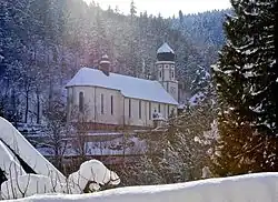Maria in der Tanne is a small baroque church near Triberg im Schwarzwald in the Black Forest of Germany. The legend behind this church dates from 1644, when a young girl was cured from an eye disease by the water of a nearby spring. Within the next year, a local tailor cured his leprosy by washing in the same spring. The thankful tailor placed a small statue of Mary in the cavity of a fir tree (from which the church draws its name -- "Mary in the Fir").