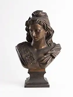 Marianne differed from Uncle Sam, John Bull, and Deutscher Michel in that Marianne was not just a symbol of France, but of the republic as well.[12] For those on the French right, who still hankered for the House of Bourbon like Action Française, Marianne was always rejected for her republican associations, and the preferred symbol of France was Joan of Arc.[16] As Joan of Arc was devoutly Catholic, committed to serving King Charles VII, and fought for France against England, she perfectly symbolized the values of Catholicism, royalism, militarism and nationalism that were so dear for French monarchists.[17] Joan was apparently asexual, and her chaste and virginal image stood in marked contrast to Marianne, whom Action Française depicted as a prostitute or as a "slut" to symbolize the "degeneracy" of the republic.[17] The contrast between the asexual Joan vs. the unabashedly sexualized Marianne who was often depicted bare-breasted could not have been greater.[18] Finally, because of Joan's status as one of France' best loved heroines, it was difficult for republicans to attack Joan without seeming unpatriotic.[19] However, the royalist attempt to have Joan of Arc replace Marianne as the symbol of France failed, in large part because most of the French people accepted the republic, and Marianne unlike Joan was the symbol of the republic.[20] In the middle of the 19th century, Marianne was usually portrayed in France as a young woman, but by late 19th century, Marianne was more commonly presented as a middle aged, maternal woman, reflecting the fact that the republic was dominated by a centre-right coalition of older male politicians, who disliked the image of a militant young female revolutionary.[21] After British and German newspapers began to mock the middle-aged Marianne as a symbol of supposed French decline, around 1900 the younger Marianne came back into vogue to symbolize that the republic was not in decline.[21]