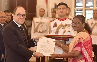 Ambassador Mariano Caucino presenting Letters of Credence to the President of India, Ms. Droupadi Murmu, July 11, 2024.