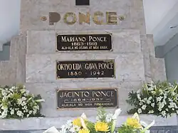 Ponce wrote his memoirs, "Cartas Sobre La Revolución" (Letters on the Revolution). He died in the Government Civil Hospital in Hong Kong, on May 23, 1918. His remains were originally interred in the Cementerio del Norte, Manila.[1] According to local historian Rolando Villacorte, his remains were transferred to the Art Deco Ponce family mausoleum in Baliuag Catholic Cemetery. There, he is interred alongside his wife, brother Jacinto, daughter Maria, and grandson Marianito Ponce Gonzales.