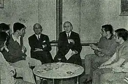 In 1973 and for reasons which are not clear Zufía did not seek prolongation of his term in the city council;[71] as a result, it expired in 1974.[72] However, the same year he stood in elections to Consejo Foral, a peculiar provincial Navarrese advisory body with rather limited powers; he was comfortably elected.[73] During final years of Francoism Zufía and his sons[74] were heavily engaged in numerous semi-clandestine activities, e.g. since 1974 in his house he hosted the editorial board of a bulletin titled Denok batean and provided residence to its chief editor.[75] In establishment circles he was viewed as a dangerous subversive; in spite of earlier arrangements he was not promoted to director of the Banco de Bilbao Pamplonese branch.[76] His relations with the bank were already loose; in the early 1970s he was on unpaid leave, which enabled him to take a job restructuring financial structures of the Pamplona diocese.[77] Eventually, in late 1975 he arranged for premature retirement from the bank and despite poor conditions offered, he did retire the following year.[78]