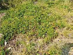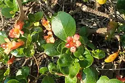 Marianthus paralius is a woody, more or less prostrate shrub that typically spreads to a diameter of up to 50 cm (20 in), and tends to become a climber as it ages. The leaves are egg-shaped and thick, the flowers red with white stamens. Flowering occurs from September to November.[2][3][4]