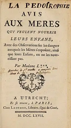- ^ a b Madame L. (1767). Avis aux mères qui veulent nourrir leurs enfans : avec des observations sur les dangers auxquels les mères s'exposent, ainsi que leurs enfans, en ne les nourissant pas. Utrecht.