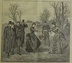 As early as 1880, she began work on a number of feminist issues, including an attempt to overturn legislation preventing women from wearing trousers.[6] In 1886, she sparked a media controversy by duelling another woman, an American, sparked by a debate regarding whether French women doctors or American women doctors were superior. France won the duel, leaving the American, Miss Shelby, slightly injured. This established her, notoriously, as a fencer and duellist. While duels were not uncommon, they were a tradition only of men.[1] Yet Astié went on to establish a women's fencing association.[7]