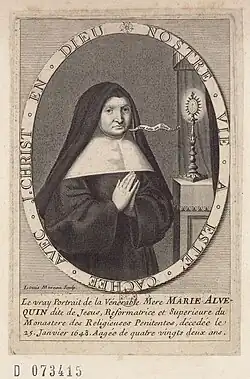 On 2 July 1616, accompanied by six other penitent sisters from Montmartre, Marie Alvequin transferred to the Monastery of Saint-Magloire in Paris.[4] Marie Alvequin shared the view monasticism had fallen into moral and spiritual decline during the religious wars that had followed the emergence of Protestantism.[3] The recent establishment at the monastery in Montmartre of the Order of the Penitent Sisters "Ordre de la pénitence de la Madelaine" was part of a wider fight-back.[4] The transfer of Marie Alvequin and her six companions to Saint-Magloire marked a further stage in the process. Marie was installed as Mother Superior (abbess). She remained at the Monastery of Saint-Magloire till her death, aged 82, early in 1642, by when she had acquired a strong reputation for her saintliness ("dans une grande reputation de sainteté").[4] During her time in charge she had quickly restored compliance with the rules. A particularly visible change regarded vestments, which were simplified and now incorporated a black veil.[4] Sources refer to a wide range of her reforms, few of which are spelled out. She removed the requirement for the nuns to get up every night for a midnight service, changing its time to 8 in the evening.[4] Instructions from the bishop, which she appears to have respected, involved the need to follow the Rule of St. Augustine.[1]