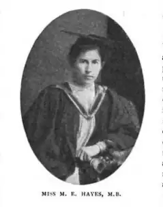 Marie E. Hayes (17 May 1874 โ 3 January 1908), a native of Raheny, Ireland, one of few early female medical graduates from Ireland in 1904, became a medical missionary and chief of Rewari Hospital in India, part of the Cambridge Mission to Delhi.[1] Hayes died unexpectedly from a pneumonia in 1908. Known for her work, passion, and character, a ward was built in her name in St Stephen's Hospital, Delhi.