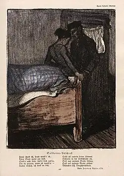 Earlier that year, Schnür had secretly given birth to a son (Klaus) in Paris; probably from a relationship with the artist Angelo Jank, although some sources point to August Gallinger, a medical student who would later become known for his exposé of crimes committed against German POWs during World War I.[2] At first, she was forced to leave Klaus with her parents in Swinemünde, but accepted an offer from Marc to enter into a marriage of convenience in 1907 so she could gain custody.[3] After only a year, she divorced Marc, charging him with adultery, and thereby prevented him from marrying Franck until 1911, because a dispensation was required.
