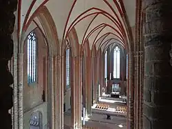 In the spacious, austerely kept interior, the cross ribbed vault with intervening separating arch was supported by the twelve richly designed, cruciform piers; the four frontal pier projections have strong Three-quarter round services (templates). The side walls have circumferential plinth zones with two pointed-arched diaphragms per bay. Above this is a walkway. The slender tracery windows are mostly in four parts. The window tracery was changed during the restorations; the tracery of the three eastern windows on the south side could be considered original. The finely profiled High Gothic interior of the church occupies a certain exceptional position within the Brick Gothic style due to these very characteristics.