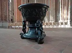 In front of the high altar was the tombstone[2] of Adelheid von der Asseburg († 1588), wife of Leonhard von Kotze, her portrait was in the right aisle. From 1581 to 1918, on the basis of a bequest, the bell was rung daily in the hour of her death at about two o'clock in the afternoon, until her endowment lapsed in the course of inflation; thus her memory remained alive in the parish.[3]