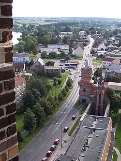 The central gate tower and Marienkirche on the Marktberg together form Prenzlau's best-known town view. Until its destruction in 1945, a row of mostly two-storey houses stood in front of the east view of the church, giving the scale for Marienkirche and thus increasing the monumentality of the east gable.[15]