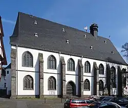 In the later Middle Ages Lich belonged to the Archdeaconate of St. Maria ad Gradus in the Archbishopric of Mainz with its own Send district - in 1435 it was not included in the Send jurisdiction of the archdiaconate.[10] The collegiate church possessed four altars, dedicated to Our Lady, the Holy Trinity, St John, and St Anne.[11] As a result of the Reformation, the collegiate church was converted to Lutheranism in 1555. The first Lutheran priest was Heinrich Götz who served from 1564 to 1567.[12] The church was renovated in 1594, as recorded by an inscription in a medallion above the choir, "One thousand five hundred four and Ninety years after Christ's birth, This church building's Renovation was With god's help brought to completion entirely in the same Year that saw The Groundstones Beginning to be laid." Galleries were built, the floor was plastered, and the church was painted.[13] In 1622, a gallery was added for the new organ.[14]