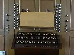 The organ was built during the Thirty Years' War between 1621 and 1624 by the organ-builder Georg Wagner of Lich and had around 20 registers with two manuals and a pedalboard, as well as wing doors on the sides.[34] The instrument was originally located where the Fürstenstuhl now stands. Between 1631 and 1633, the organ was expanded with the two pedal towers of the organ of Arnsburg Abbey which was probably also built by Wagner around 1607. These were brought to Lich to protect them from being plundered by Swedish troops. The Lich-based organ firm, Förster & Nicolaus Orgelbau relocated the organ in 1861 from the small gallery in the ambulatory to the west gallery and modified its tuning. The instrument was modified repeatedly by the firm over time. In 1913, a substantial renovation took place in the course of which the organ received tubular-pneumatic action, cone chests, a free-standing console, an expression pedal and several new registers. A further rearrangement followed in 1941 in the course of the organ reform movement. In 1961, the empty rear housing was refilled with new registers in a slider chest. A new organ with mechanical tracker action was installed in the old housing, incorporating the old registers, in 1972. Finally, further tunings were added in 2002, so that the modern instrument contains over 39 registers and can adequately reproduce a broad range of styles.[35]