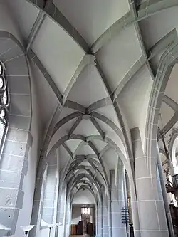 The plaster-coated wooden barrel vaults in the central nave replaced a massive stone vault in 1555[18] or 1594.[19] The Renaissance scrollwork (which was revealed in 1952) is cut off by a faux-marble wooden cornice, which supports the idea that the barrel were added as part of a renovation.[20] This cornice rests on wooden columns with Corinthian capitals. Above the wooden barrel, the original ceiling beams are still in place.[18] In the side aisles there is late gothic rib vaulting, which was probably originally intended to be installed in the central nave as well, but never added due to financial limitations. The narrow side-aisles allow access to the ambulatory, which is separated off by narrow, almost round arches, and in this way reflects a novel Renaissance influence. The galleries above the side aisles, which terminate at the choir and are accessed through three spiral staircases in the west wall, are supported by solid round columns.[9] These columns extend up to the abutment of the main aisle's barrel vault, which forms a secondary arcade above the gallery. At the top of the eastern pillar on the southern side, indications of the original plan for rib vaulting in the central nave can be seen. The pillars of the choir also show signs of the planned rib vaulting.[7] Under the altar there is a crypt, containing the bodily remains of the counts and their family.[21]