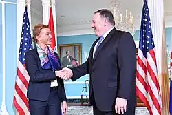 Marija Pejčinović Burić (pronounced [mǎrija pejt͡ʃǐːnoʋit͜ɕ bûrit͜ɕ]; born 9 April 1963)[1] is a Croatian politician of the centre-right Croatian Democratic Union party who served as Minister of Foreign and European Affairs and First Deputy Prime Minister of Croatia from 2017 to 2019. She was the third woman to hold the post of foreign minister, following Kolinda Grabar-Kitarović and Vesna Pusić. Pejčinović Burić previously served as a Member of Parliament during its Sixth Assembly (2008–2011), representing the 6th electoral district.