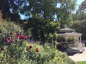 The Marin Art and Garden Center's master plan was designed by landscape architect Thomas Church.[8] It contains several different gardens, including those focused on roses, edible plants, plants used in basketry, and native plants.[9] There are three species of redwood on the site, including the dawn redwood.[6] A giant sequoia on the property was brought in from Yosemite Valley during the Worns' ownership.[4]