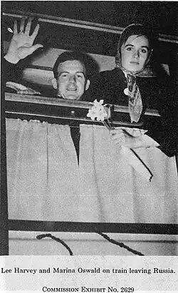 Marina met Lee Harvey Oswald (a former U.S. Marine who had defected to the Soviet Union) at a dance on March 17, 1961.[6] They married six weeks later on April 30[7] and had a daughter, June Lee Oswald, born in February 1962.[8] In June 1962, the family immigrated to the United States and settled in Fort Worth, Texas where Lee's brother Robert lived at the time.[9] At a party in February 1963, George de Mohrenschildt introduced the couple to Ruth Paine, a Quaker and Russian language student.[9] The Oswalds moved to Dallas and then to New Orleans, Louisiana in 1963 before returning to Dallas later in 1963.