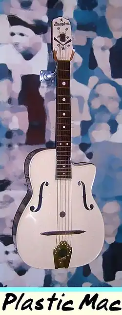 In 1941, Maccaferri patented a plastic woodwind reed, in 1947 he patented two plastic clothespin designs, and in 1949 he launched his line of plastic "Islander" ukuleles in collaboration with television star Arthur Godfrey, which would sell into the millions of units.[5] Maccaferri also developed the Chord Master, an automatic chording device originally designed for the ukulele.[6] In the 1950s, Maccaferri produced a line of plastic guitars, but they had little commercial success.[7][8] Later in his career and up until his death, Maccaferri worked on the design for a plastic violin, which in 1990 was used at a performance at Carnegie Hall.[9][10]
