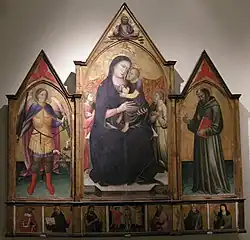 A relatively large number of securely attributed works by Mariotto survive. These include an altarpiece of the Virgin and Child with Saints for the church of S Donnino at Villamagna, Bagno a Ripoli (in situ); a triptych of the Assumption of the Virgin with St Jerome and St John the Evangelist (1398; Fiesole, Fontelucente Church); a polyptych of the Virgin and Child with Saints and a predella with scenes from the Life of the Virgin (Florence, Accad.) from the convent of S Gaggio, Florence; the Coronation of the Virgin (Florence, Certosa del Galluzzo, Pin.); the Trinity (Impruneta, S Maria); and an altarpiece of the Virgin and Child Enthroned with Saints for S Leolino at Panzano in Chianti (in situ).[3]