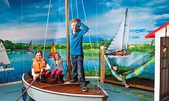 This exhibit simulates the search for oil, gas, wind energy and renewables at sea. It showcases the work done by drillers, crane operators, windmill specialists and helicopter pilots.[1]