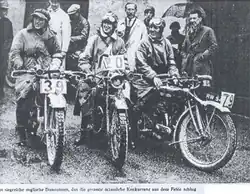 The Triumph was then used in a hill climb held by the Liverpool MCC. As the only female entrant and one of only 2 people out of 300 entrants to succeed in reaching the top of the hill she gained a lot of publicity.[5] She rode in her first motorcycle trial in 1920, the Blake Amateur Trial. After winning a gold medal in the North Wales Open Trial a motorcycle manufacturer in Wrexham, Powell, gave her a works supported machine.[6] She later had works support from Raleigh, BSA[7] and Triumph.[8] Works support ranged from a specially prepared new machine along with some financial support to a small discount on spares. British motorcycles were exported worldwide, and many were marketed on competition success. Therefore. the riders as well as the makes became famous.
