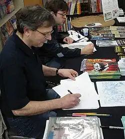 ![]() Mark Marderosian (foreground) sketching for Free Comic Book Day attendees at "That's Entertainment", Worcester MA in 2008. | |