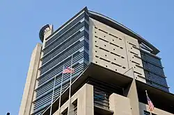 The building's main entrance is located on its west elevation. The glass and steel storefront entrance is recessed at an angle from the plane of the elevation behind a row of massive pillars and is sheltered under a projecting metal canopy. The exterior wall surfaces of the eight-story block (southern half of the elevation) above the canopy is smooth limestone veneer with punched window openings, one such being a five-story opening which constitutes virtually half of the wall surface. It is divided into four bays by vertical metal fins which terminate as flagpoles or decorative poles and horizontally by metal spandrels and mullions. The top floor of the eight-story block contains the law library. Its west elevation is fully glazed and recessed from the plane of the elevation and set under another projecting metal canopy. An open-air rooftop terrace caps the eight-story block. The northern half of the west elevation above the main entrance canopy consists of the 16-story smooth limestone and glass and steel curtain wall tower. The northwest corner is a solid limestone shaft. A curved elevator penthouse with projecting metal skirt rises above the shaft like a campanile. The curtain wall portion follows the same recessed angle back from the plane of the elevation as the main entrance. The curtain wall is divided horizontally by projecting fins at the floor plates and intermediate window mullions.[5]