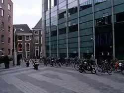 The pavement pattern was designed by the American artist Sol LeWitt. The square houses the entrance of the Netherlands Film and Television Academy, the parking garage Markenhoven and the Grand Cafe Allure.