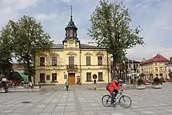 The town hall stands on the site of an earlier building with the same function. The description of the previous town hall can be found in documents from 1767. The town hall was then a recently built wooden building. It was covered with a shingle roof and surrounded by arcades supported by poles. It also had a tower. Apart from the seat of the municipal authorities, there was also a prison.[1] The foundations of the former town hall were discovered during the revitalization of the Market Square in 2012.[2]