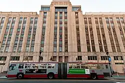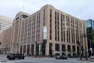 The building is primarily designed in the Art Deco style,[7][8][9][10] with additional elements of Mayan Revival architecture.[3][4] A penthouse was given a later renovation in the International Style.[3] The building was designed by the architectural firm of Capital Co. Architects, though preservationists are not sure of any of the specific architects who were involved in the project.[3] In its current configuration, after several extensive renovations and expansions, it has an L-shaped layout, with frontages along Market, Ninth, and Tenth Streets.[3] Each façade has multiple sand-colored terracotta columns that are separated by friezes and accompanied by grate work over each entryway.[3] Between all 11 stories,[7][11] it has a floor area of approximately 1,000,000 square feet (93,000 m2).[2][10] It is connected to a nearby building on the same block by a skyway.[12]