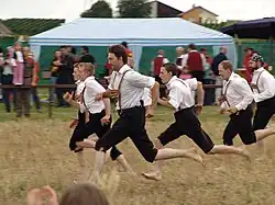 The race is preceded by a ceremonial mass, a colorful procession to the race field featuring many bands and groups in traditional costumes and also several sheep, and traditional games such as sack races and water-carrying. Following the race, the procession returns to the town square for the dancing. On the Sunday many of the festivities are repeated, including the procession, but this time children from the local schools run the races while adults compete separately at water-carrying and stilt-walking.[11]