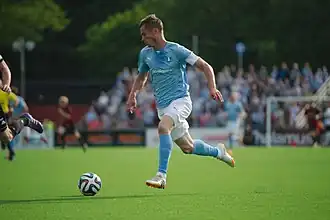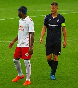 Ahead of the 2015 season, it was announced that Rosenberg was the new captain for Malmö FF, succeeding Molins.[285] Rosenberg started the season well scoring two goals in the four Svenska Cupen matches.[286][287] In a 4–1 win against GIF Sundsvall in the opening game of the season, he scored and set up the club's second goal of the game.[288] Having been linked a move away from Malmö FF earlier in the season, Rosenberg put the transfer rumours aside when he signed a contract extension with the side, keeping him until 2017.[289][290] From the start of the 2015 season, Rosenberg retained his first team place as well as his captaincy of the side.[291][292][293][294][295] He only scored two goals in the next three months, which came against Hammarby on 20 April 2015 and another came against Åtvidaberg on 31 May 2015.[296][297] Between mid–July and August, Rosenberg began a goal scoring spree, adding eight goals to his tally.[298][299][300][301][302] One of the goals came in Malmö's 3–0 return leg win over Red Bull Salzburg in the third qualifying round for the 2015–16 UEFA Champions League on 5 August 2015.[303] Thanks to an aggregate score of 3–2, Malmö eliminated Salzburg for the second successive season, contributing to Salzburg's run of eight unsuccessful attempts to qualify for the Champions League since being purchased by the Red Bull company in 2005.[304][305] In their home match on 25 August 2015, Rosenberg scored the first goal as Malmö defeated Celtic 2–0, winning 4–3 on aggregate and thereby qualifying for the Champions League group stage for the second consecutive year.[306][307] He later scored four more goals later in the 2015 season, including a brace against Kalmar on 17 October 2015.[308][309][310] After serving a one-match suspension, Rosenberg returned to the starting line-up in the last game of the season against IFK Norrköping, only to be sent off in the 5th minute of the match, as Malmö lost 2–0.[311][312] Malmö FF were unable to follow up their success in European qualifying with a league title in 2015, disappointingly finishing in fifth place.[313][314] Having been out of the first team on three occasions during the 2015 season,[315][316][317] Rosenberg finished the season with 42 appearances and 16 goals in all competitions.
