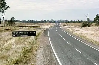 The town lies on the Bruce Highway, 106 kilometres (66 mi) north west of the city of Rockhampton. The town is a small service centre for the surrounding area, and one of a number of fuelling points on an otherwise isolated stretch of highway.