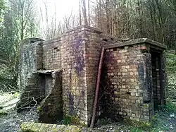 After closure, the headgears and other machinery at Marley Hill Colliery were scrapped and the buildings levelled. A hole was knocked into the wall of the square building which enclosed the top of the upcast shaft, and the rubble from the rest of the buildings tipped in to backfill it. This process having been completed, the building was demolished and a large concrete cap placed over the mouth of each shaft. There appear to be only two remaining buildings directly associated with the colliery. One of these is an airlock above a backfilled ventilation shaft from the Clockburn Drift, hidden away in Clockburn Wood near Whickham. The shaft was known as the Hollinside Shaft and actually pre-dates the drift as it was originally part of Axwell Park Colliery,[17] which was situated roughly a mile to the north-east. This colliery closed in 1954 after men from Marley Hill began working its remaining reserves beneath Hollinside and Gibside via the drift, at which point the NCB installed a fan to aid ventilation, these workings being some distance from the Shafts at Marley Hill Colliery itself. The other remaining structure is a curious rendered brick hut with double-walled construction and heavy steel doors, which stands in the middle of a field to the south of St. Cuthbert's Park. It is best to consult Google Earth to pinpoint the location. This is the colliery's former powder magazine, where explosives for use underground were stored. It was presumably constructed sometime in the first couple of years of the 20th century, as the bricks used, which bear the name "Blythe & Sons, Birtley Station" along with the letters ER (Edward VII) and the date 1901, are of the same type (stamped 1903 and 1904) used to construct Church Street, Cuthbert Street and Glamis Terrace. It has evidently been designed to direct the force of any explosion upwards, with its isolated location meaning that the resulting debris would not land on the surrounding houses or colliery buildings. It is (for unknown reasons) sometimes referred to locally as "the butterfly chambers" and fell out of use some time before the colliery closed, with one former Marley Hill miner recalling playing in it as a child. A new explosives store was built to replace it, this building being situated near the pit head baths.