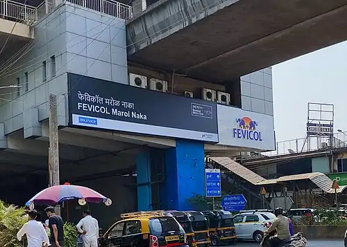 Marol Naka is an interchange metro station serving the Marol neighbourhood of Andheri in Mumbai, India. Elevated station serves for the East-West Corridor of the Blue Line 1 of Mumbai Metro. It was opened to the public on 8 June 2014.[1] The Underground station serves for the North-South Corridor of the Aqua Line 3 of Mumbai Metro. It was opened to public on 7 October 2024.
