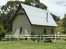 On Sunday 17 November 1907, Archbishop St Clair Donaldson officially opened and dedicated St Andrew's Anglican Church. The church was capable of seating 120 people. The land was donated by J. J. Prout. The builder was carpenter and farmer Frederick William Cook of Cotswold Cottage. In 2019, the church was closed and deconsecrated in 2019 and is now used as a bed-and-breakfast accommodation. It is on Lot 2 Newlove Road behind the School of Arts (28°10′24″S 152°43′13″E / 28.1733°S 152.7204°E).[13][14][15][16][17]
