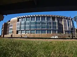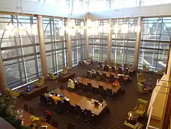 Eckstein Hall is located on the eastern end of the Marquette campus, two blocks from the Milwaukee County Courthouse and a mile from the Federal Courthouse. At 200,000 square feet, the building is four stories tall. It includes a four-story "library without borders,"[15] two mock courtrooms, a four-story atrium (the Zilber Forum), a cafeteria, a workout facility, a conference center, classrooms and faculty offices.[16][17] The classrooms were all designed as "smart classrooms" with projectors, cameras, audio recording, and individual microphones built into classroom seating.[18][19]