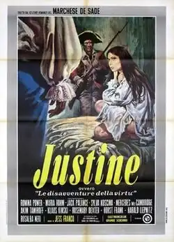 Marquis de Sade: Justine (Italian: Justine ovvero le disavventure della virtù, lit.'Justine or the misadventures of virtue', also released as Deadly Sanctuary)[1] is a 1969 erotic period drama film directed by Jesús Franco, written and produced by Harry Alan Towers, and based on the 1791 novel Justine by the Marquis de Sade. It stars Romina Power as the title character, with Maria Rohm, Klaus Kinski, Akim Tamiroff, Harald Leipnitz, Rosemary Dexter, Horst Frank, Sylva Koscina and Mercedes McCambridge.
