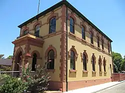 The town hall at 96-106 Illawarra Road was opened in 1879. In 1883 a two-storey addition was added, together with a portico and steps with a lion couchant on either side.[1]