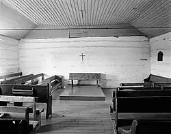 A fire set by an arsonist nearly destroyed the building in 2006.[3] After two years of fundraising and construction it was re-dedicated on June 8, 2008. Some of the original logs that were charred in the fire are still a part of the structure.[4] It is one of the largest log buildings and one of the oldest log churches still in use in Iowa.[1][2] A worship service is held in the now interdenominational church yearly in June.