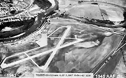 During the war the old strips had to be surfaced and lengthened to take increased traffic and heavier, faster planes. Two concrete runways, each 4,500 feet long and 150 feet wide, six taxiways and 5,400 square yards of parking apron were laid down to meet the new needs.