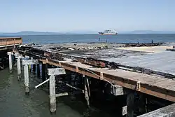 By the 1940s, the Kinney complex had expanded "significantly".[4] In 1954, an outbound cargo ship carrying 8,000 tons of grain ran into the complex, part of which was lost.[4][8] Remaining buildings were used for storage until 1980 and have since been converted to shops.[8] Part of the complex was restored and a lookout was built on its wharf to encourage business;[11] however, other parts of the Kinney complex remained in ruins.[8] The cannery was added to the National Register of Historic Places on June 30, 1989.[1] However, the complex was delisted from the Register on September 8, 1997.[2] It housed Gunderson's Cannery Café and other small businesses until a fire destroyed the buildings in December 2010. Discussions of condominium development have taken place, including Riverpark Suites for the "ruined half" of the complex.[4][8]